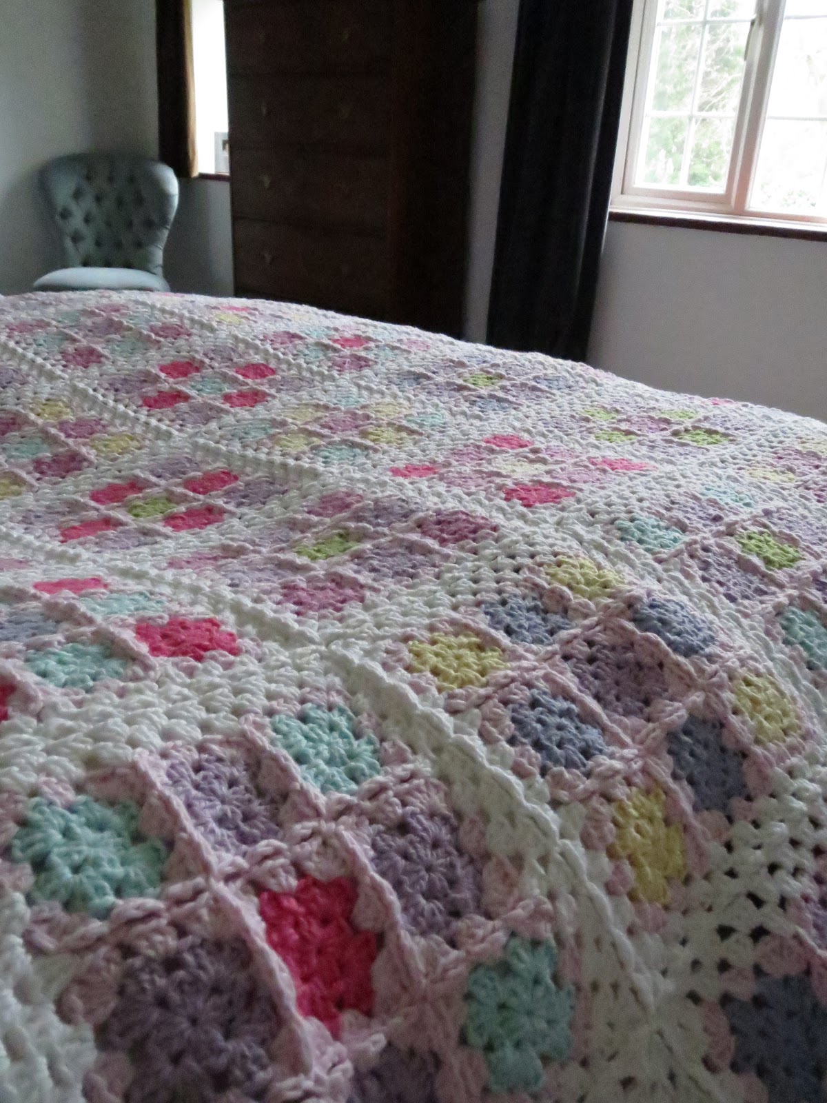 Så var den då äntligen färdig. Köpte ett nystan King Cole Bamboo Cotton i blekrosa tidigt förra våren och det var det som startade det hela. Jag blev kär i garnet och kär i färgen. Först tänkte jag virka bara enfärgade rutor, men jag är definitivt en kantperson - tycker om hur kanten ramar in och knyter samman filten. Så istället gjorde jag småfiltar med nio rutor i varje, som jag sedan virkade ihop. Alla niorutskombinationer är olika och ingen samma färg är kant i kant. Det tog lång tid att pussla ihop. Och det blev ända fel. Såklart!